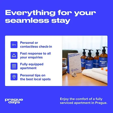 Οι επισκέπτες μπορούν να χρησιμοποιήσουν χώρο καθιστικού, καθώς και να απολαύσουν διάφορες ανέσεις στο δωμάτιο, όπως τηλεόραση επίπεδης οθόνης. Το Prague Days - Modern Apartments W Easy City Access διαθέτει ξεχωριστή τουαλέτα και ντους για να εξασφαλίσει την άνεση σας. Στο μπάνιο επίσης υπάρχουν στεγνωτήρας μαλλιών και μεγάλες πετσέτες μπάνιου.